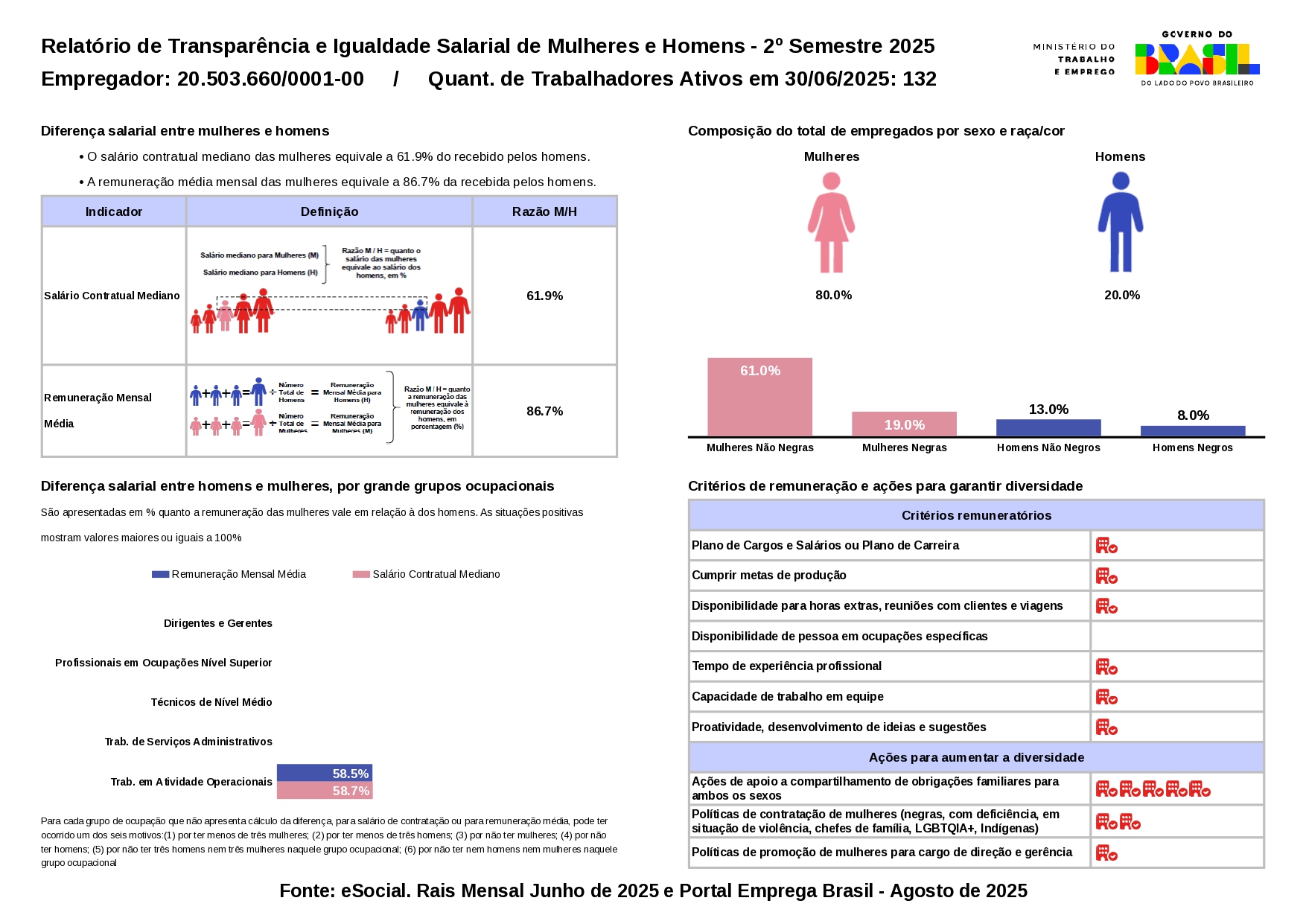 As informacões contidas no Relatório de Transparência Salarial e Critérios Remuneratórios são extraídas do Sistema Simplificado de Escrituracão Digital das Obrigacões Previdenciárias, Trabalhistas e Fiscais – eSocial. Essas informacões são o CNPJ do estabelecimento; número total de trabalhadores empregados no mesmo estabelecimento, separados por sexo, raca e etnia, com os respectivos valores medianos do salário contratual e valor médio da remuneracão bruta, média de 12 meses; e cargos ou ocupacões do empregado contidos na Classificacão Brasileira de Ocupacões (CBO) e ainda a proporcão dos salários e da remuneracão das mulheres, em comparacão a dos homens.